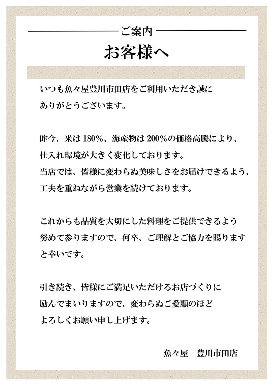 信頼のおける米穀店との協力で、艶・粘り・味の最適なバランスを考えてブレンドされたオリジナルの魚々屋米です。こしひかり・ひとめぼれを使用し、共にAランク米を使用しております。多くのお客様に「ご飯が美味しい」と好評いただいております。和食の基本は、「美味しいご飯」にあり。